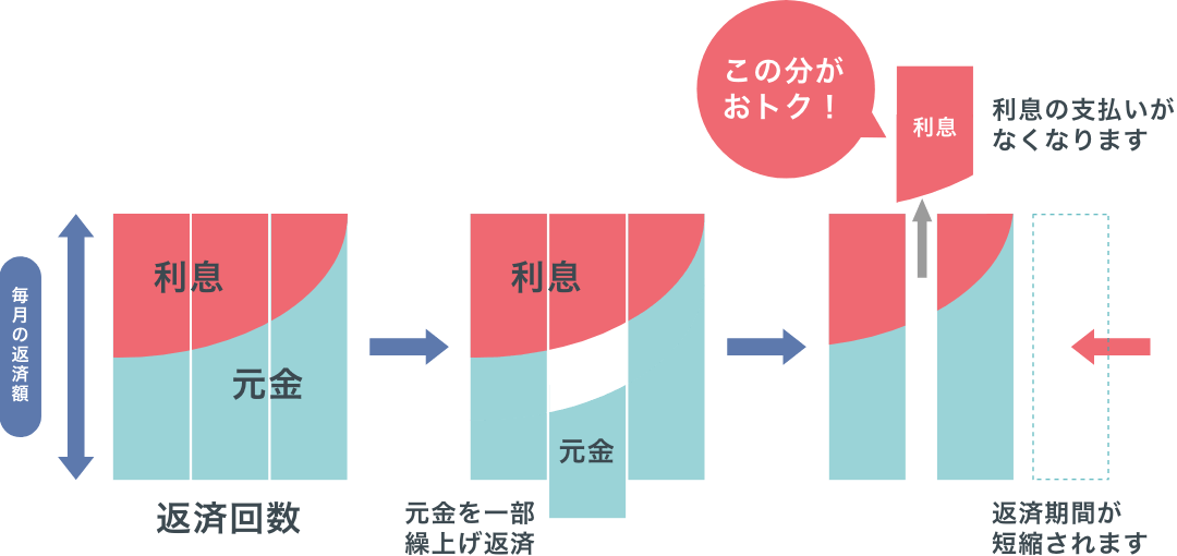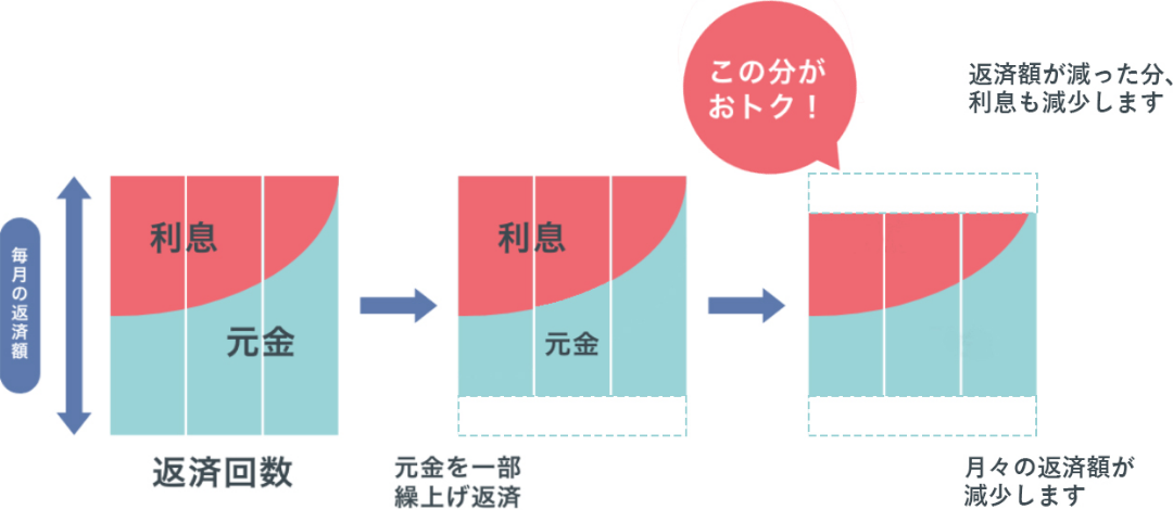 繰上げ返済された金額は、元金部分の返済に充てられますので、その元金にかかるはずだった利息も減り、総返済額を抑えることができます。