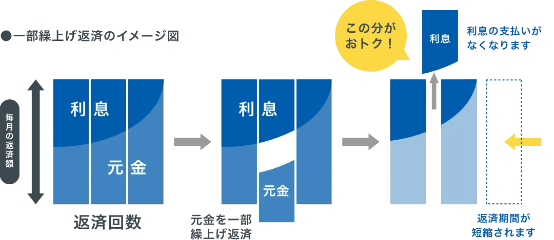毎月のご返済とは別に、ローンの一部もしくは全額をご返済するお手続きのことを「繰上げ返済」といいます。繰上げ返済された金額は、元金部分の返済に充てられますので、その元金にかかるはずだった利息も減り、返済期間が短縮できます。