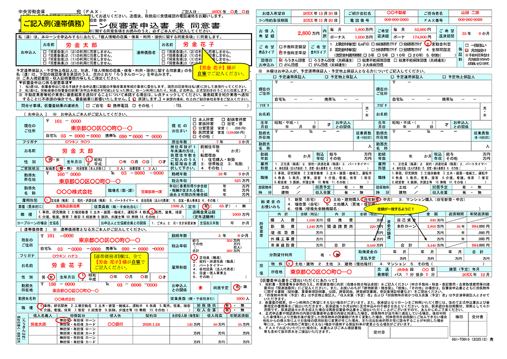 【注】〔連帯債務者〕欄は、連帯債務者となるご本人がご記入いただきますようお願いします。また、〔予定連帯保証人・予定物上保証人〕欄は、お申込人が連帯保証人・物上保証人となられる予定の方についてご記入いただきますようお願いします。